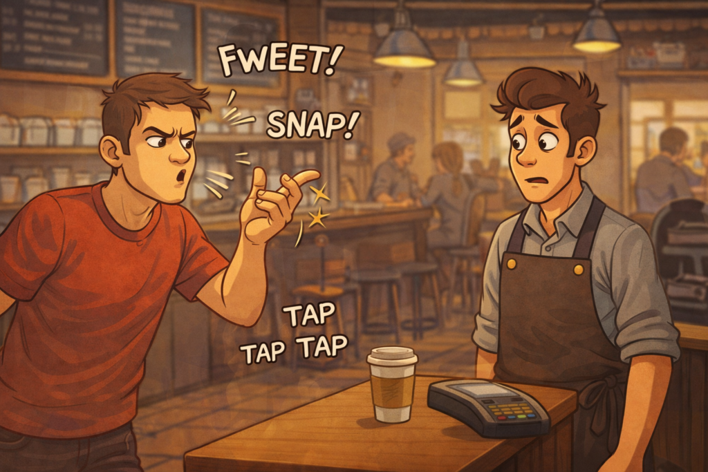 If your method of getting attention involves snapping your fingers, whistling, tapping the counter repeatedly, or leaning halfway over the bar like you’re trying to flag down ground crew at an airport, please know that every barista in the room has already formed an opinion.
