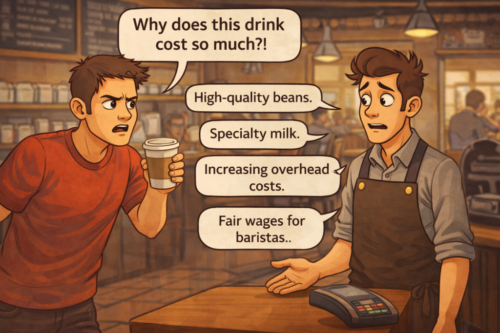 Someone orders a large iced latte with alternative milk, extra espresso, added syrup, cold foam, and some additional preference that requires both labor and ingredients, then looks at the total like we’ve personally betrayed them.