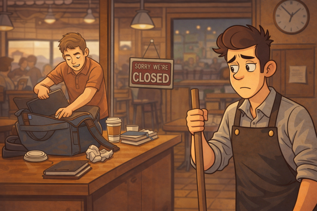 The posted hours were not a vague suggestion. Closing time is not when you begin considering whether you should leave. That decision was meant to happen earlier, back when the lights started changing and the chairs were making their little end-of-day noises.