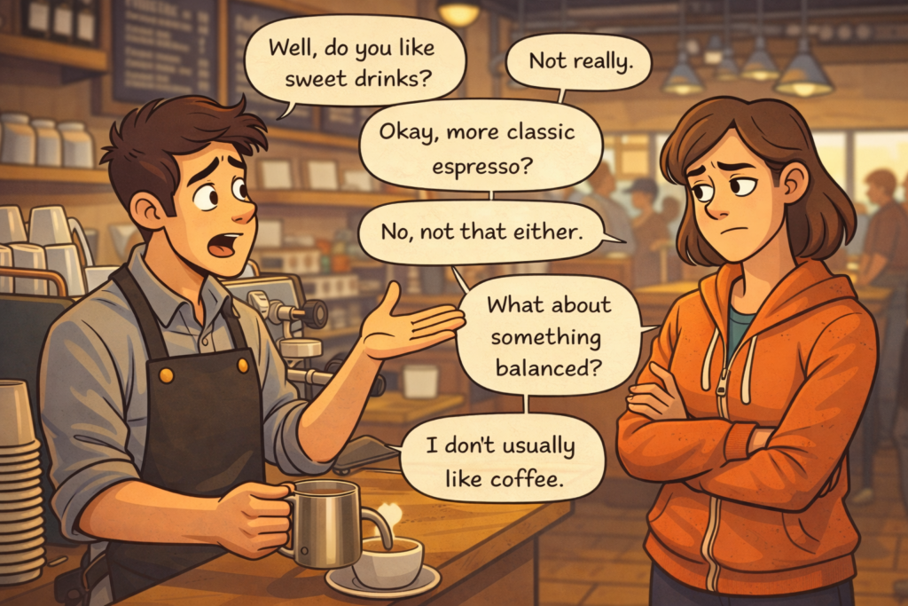 There is always a brief moment where the barista becomes less of a person and more of a customer service sherpa, gently guiding someone through terrain they could’ve studied for six seconds before stepping forward.