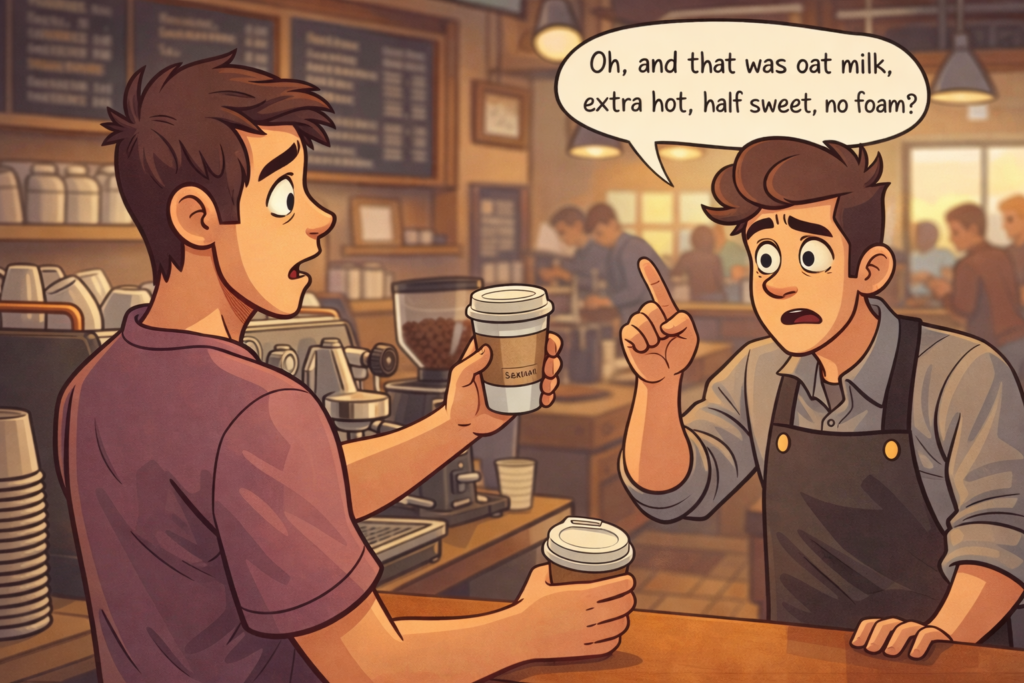 If you wait until the milk is steamed, the espresso is pulled, the lid is halfway on, and then suddenly say, “Oh, and that was oat milk, extra hot, half sweet, no foam, right?” you are no longer ordering. You are introducing chaos after the fact.